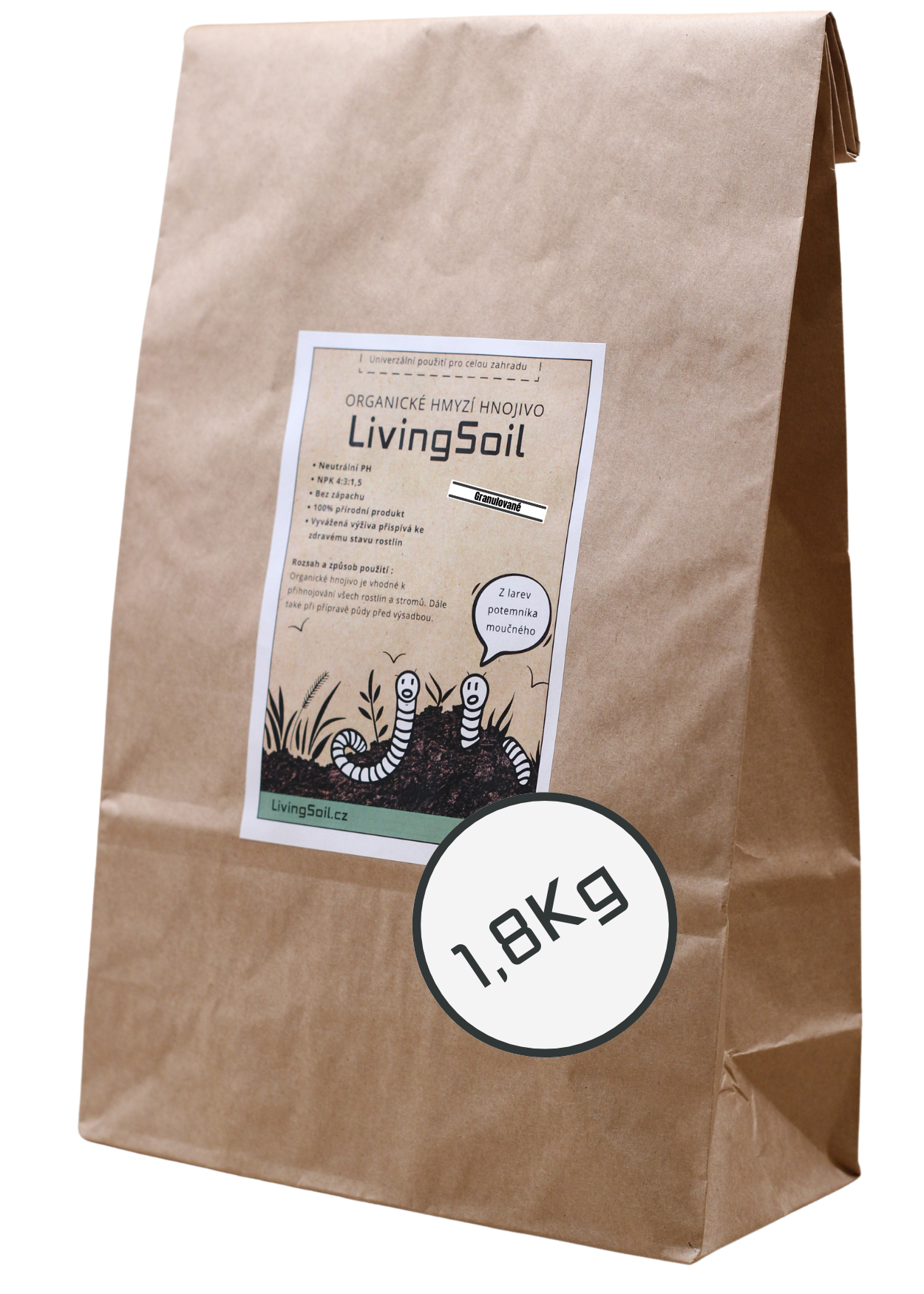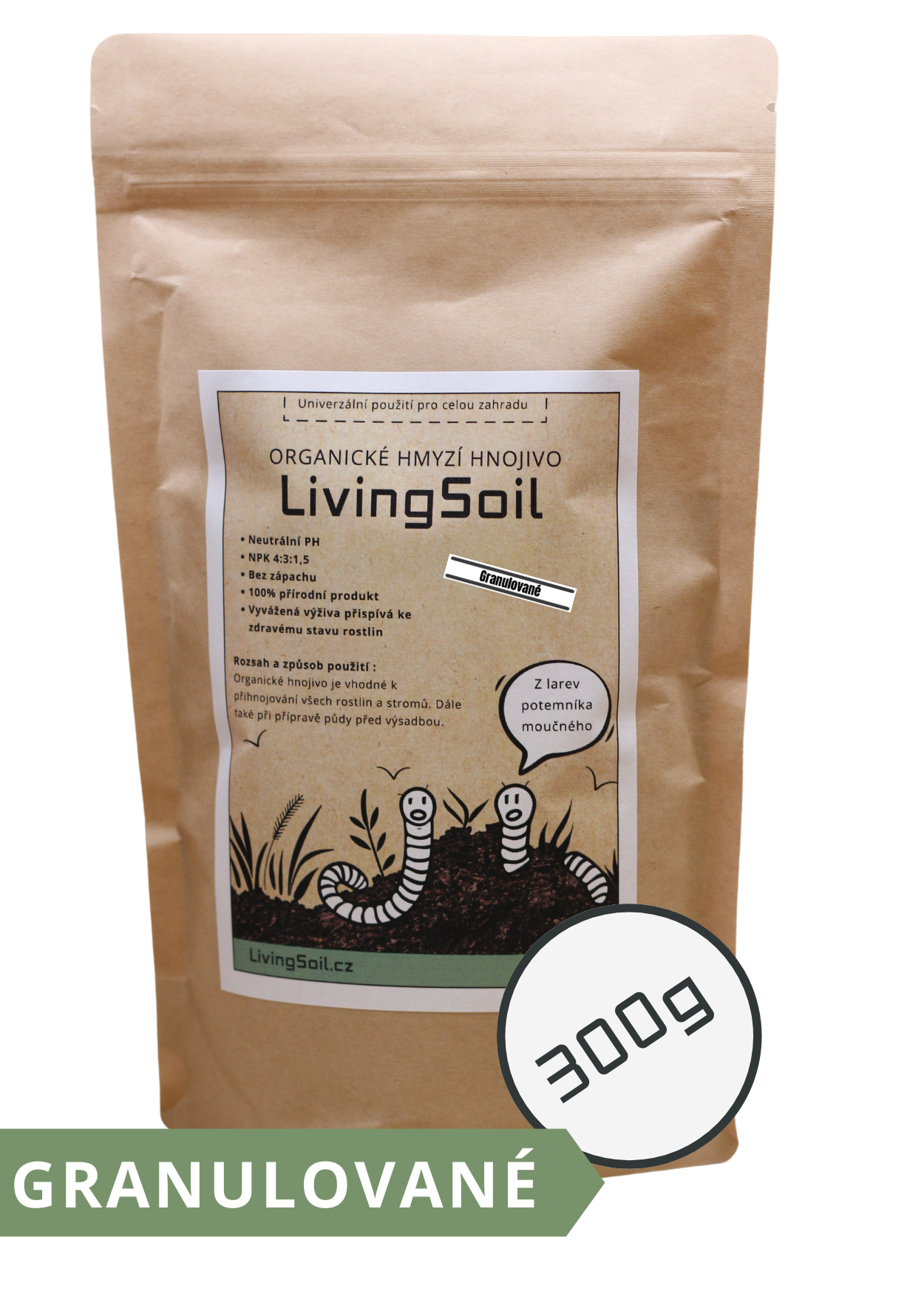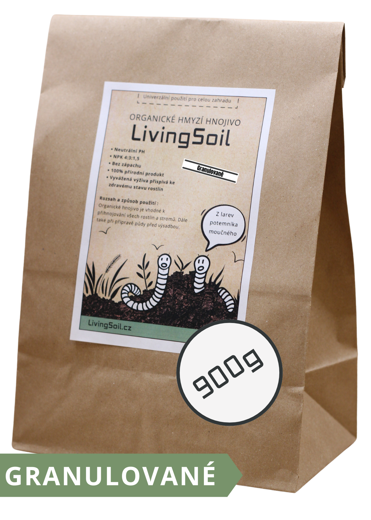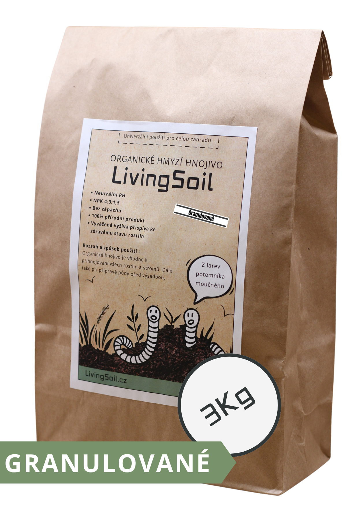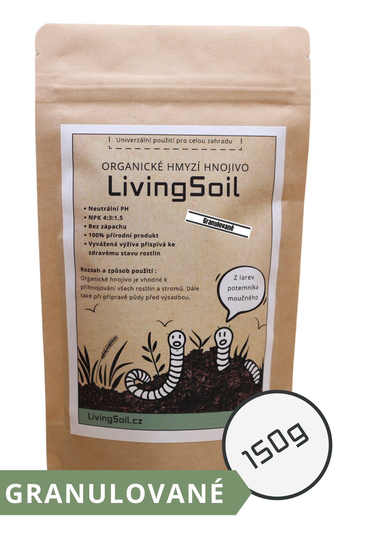 Naše hnojivo z hmyzího trusu pochází z larev potemníka moučného, které přeměňují organický odpad v přírodní zázrak plný živin a prospěšných mikrobů. Larvy jsou krmeny jen kvalitním krmivem, sestávajícím převážně z vedlejších produktů z obilovin, ovoce a zeleniny, samotné larvy se totiž používají v potravinářském průmyslu.