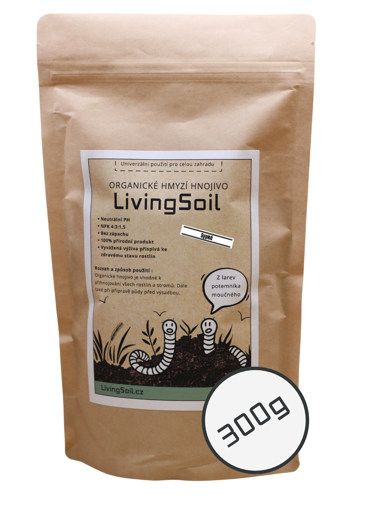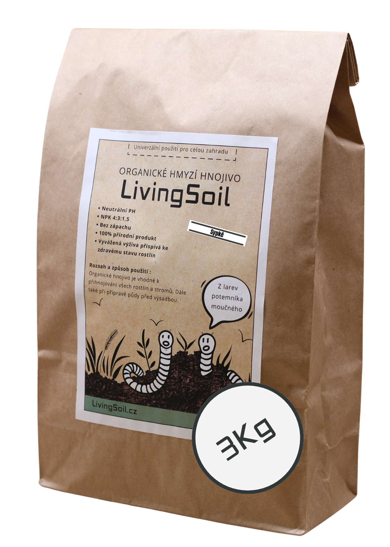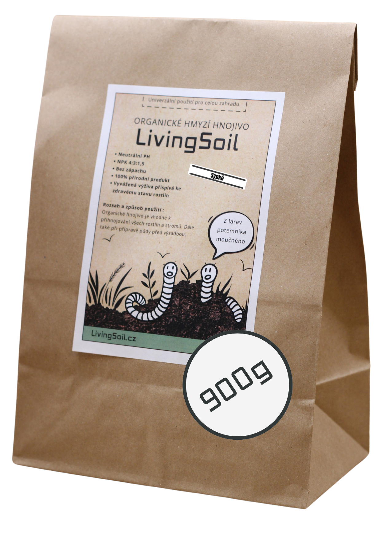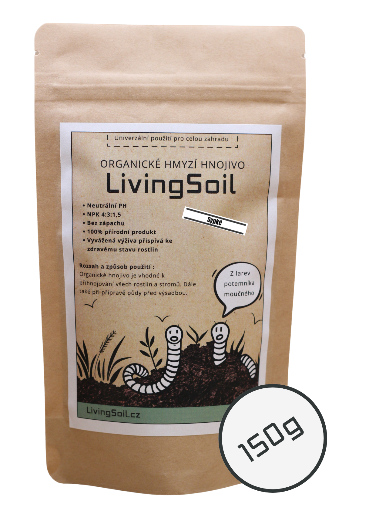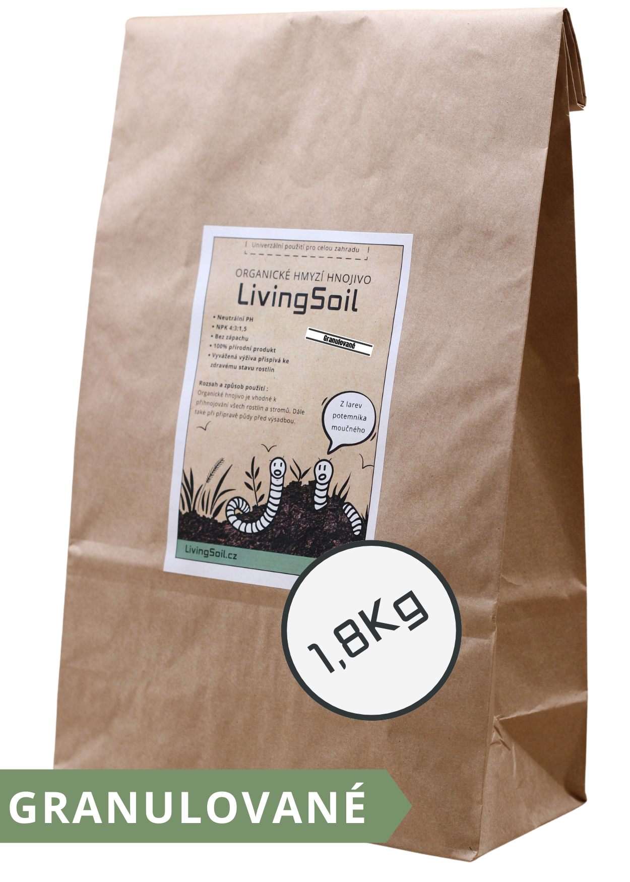 Naše hnojivo z hmyzího trusu pochází z larev potemníka moučného, které přeměňují organický odpad v přírodní zázrak plný živin a prospěšných mikrobů. Larvy jsou krmeny jen kvalitním krmivem, sestávajícím převážně z vedlejších produktů z obilovin, ovoce a zeleniny, samotné larvy se totiž používají v potravinářském průmyslu.
